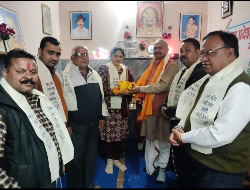 हिन्दी प्रचार समिति की बैठक में नवीन पदाधिकारियों का माल्यार्पण कर हुआ स्वागत ।