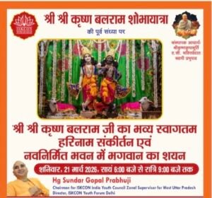 मुरादाबाद :: मेयर विनोद अग्रवाल के नया मुरादाबाद स्थित नवनिर्मित भवन में श्री कृष्ण बलराम शोभायात्रा से पूर्व धार्मिक संध्या का आयोजन किया जा रहा है। इस आयोजन में श्री कृष्ण बलराम जी का शयन कराया जाएगा। इस अवसर पर भव्य और दिव्य भजन संध्या का भी आयोजन होगा। रामगंगा विहार स्थित महापौर आवास पर 21 मार्च की शाम 6 बजे से रात 9 बजे तक हरिनाम संकीर्तन का आयोजन किया जा रहा है। कार्यक्रम में भगवान श्री कृष्ण एवं बलराम जी के भव्य स्वागत के साथ हरिनाम संकीर्तन का आयोजन होगा। साथ ही नव-निर्मित भवन में भगवान का शयन भी कराया जाएगा, जो श्रद्धालुओं के लिए विशेष आकर्षण का केंद्र रहेगा। इस अवसर पर प्रसिद्ध वक्ता एवं सुन्दर गोपाल प्रभु जी विशेष रूप से उपस्थित रहेंगे, जो भक्तों को आध्यात्मिक संदेश देंगे।